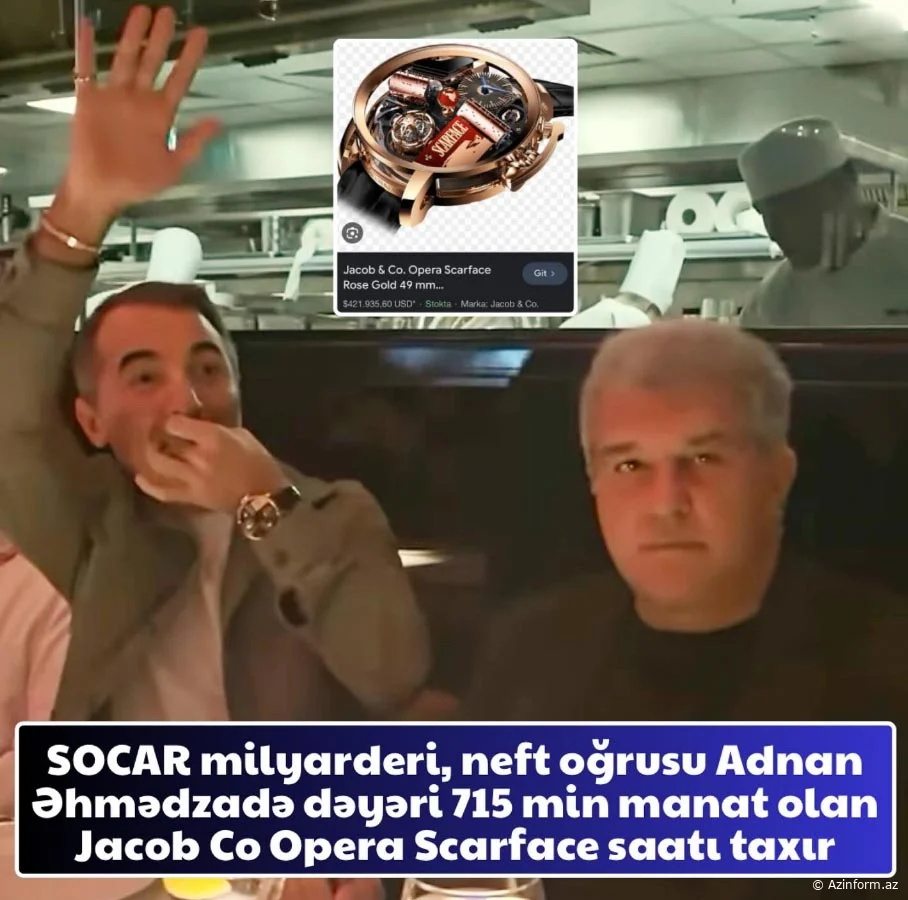 A.Əhmədzadə növbəti bahalı əyləncəsi isə “Barselona”nın prezidenti Xuan Laportanın qonağı olması olub. Məclisdə sağlığımıza "Azərbaycan" mahnısını oxuyub, milyonlar püsgürdüb. Hətta "Tiktok" sosial şəbəkəsində "Çay verərsən?" trendinə də qoşulub. Burada diqqət çəkən məqamlardan biri də A.Əhmədzadənin qolunda olan dəyəri 715 min azərbaycan manatı olan "Jacob Co Opera Scarface" saatı olub. Dünyada bu saatdan cəmi 88 ədəd var. Saat 1983-cü ildə Amerika kriminal dramı "Scarface"in şərəfinə hazırlanıb.