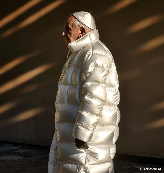 "Papa Fransisin ağ palto geyindiyini göstərən görüntü süni intellektlə dəstəklənən tətbiq ilə yaradılıb. Şəkil ətraflı araşdırıldığında bəzi təhriflər nəzərə çarpır. Sözügedən görüntü, süni intellektin vizual hazırlıq proqramı olan Midjourney AI ilə hazırlanıb. "