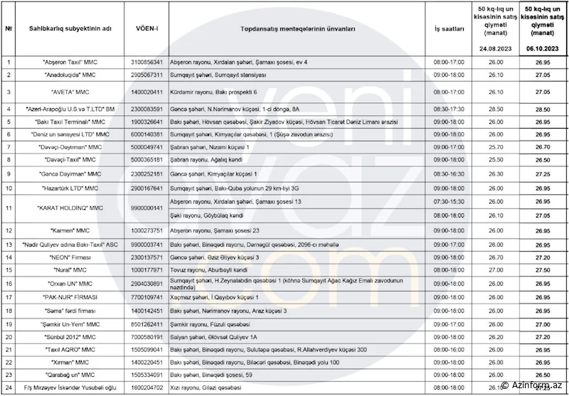 Qeyd edək ki, Azərbaycanda unun topdansatışı ilə 23 şirkət və bir fərdi sahibkar məşğul olur. Əksər satış mərkəzlərində qiymət artımı qeydə alınıb.