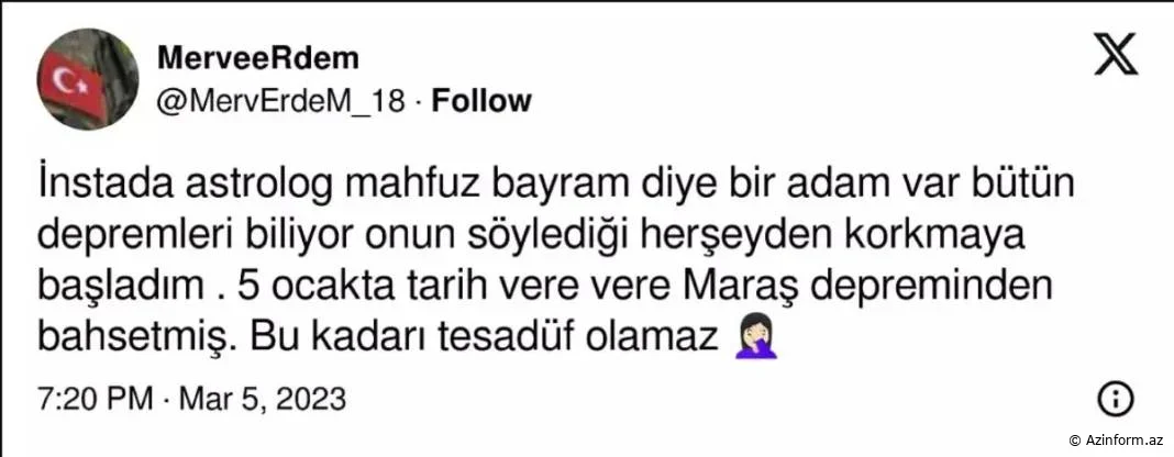 AZİNFORM.AZ bildirir ki, Onedio-da yer alan xəbərə görə, məşhur astroloq əvvəlki zəlzələ proqnozlarında haqlı olub. İş o yerə çatıb ki, sözügedən astroloqun keçən il 11 vilayətdə böyük dağıntılara səbəb olan 6 fevral Kahramanmaraş zəlzələlərindən xəbərdar olduğu və yanvar ayında bu barədə paylaşım etdiyi iddia edilir.