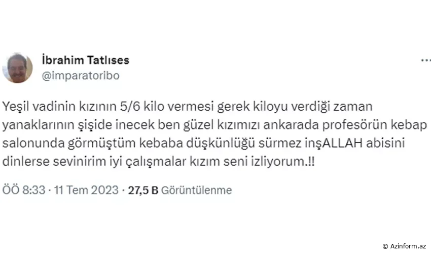 Aktyorluğu ilə gənc yaşlarından tamaşaçıların qəlbində taxt quran Beren Gökyıldız İbrahim Tatlısəsin gündəmində olub. Şəxsi Twitter hesabında paylaşım edən Tatlısəs 13 yaşlı aktrisa Beren Gökyıldızın çəkisini paylaşaraq, “Onun 5-6 kilo arıqlaması lazımdır. Arıqlayanda yanaqlarındakı şişkinlik azalacaq. Qızımızı Ankarada kababxanada gördüm; İnşallah kabab həvəsi davam etməyəcək” .
