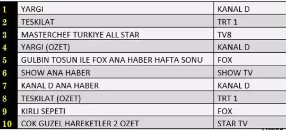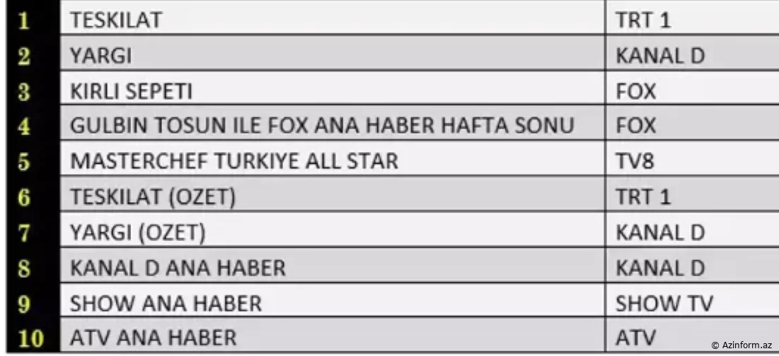 “Total”da TRT1-in məşhur serialı “Təşkilat” 1-ci, Kanal D-nin uğurlu istehsalı olan “Hakim” 2-ci, FOX TV-nin yeni serialı “Kırlı Sepeti” isə 3-cü yerdə qərarlaşıb.