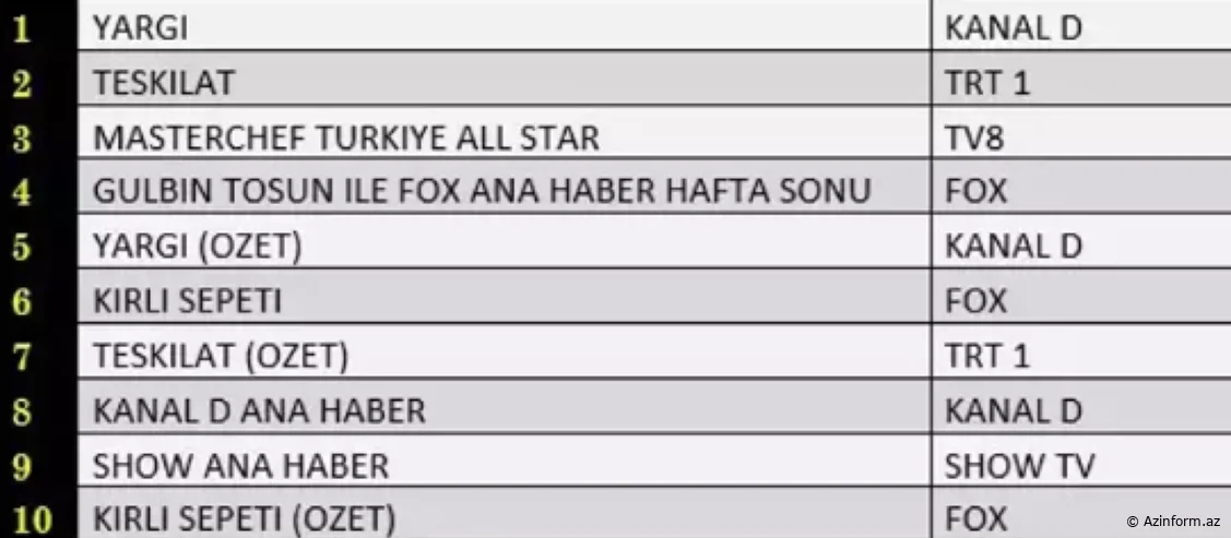 Noyabrın 19-u bazar günü üçün reytinq nəticələri açıqlanıb.