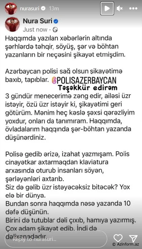 “Haqqımda yazılan xəbərlərin altında şərhlərdə təhqir, söyüş, şər və böhtan yazanların bir neçəsini şikayət etmişdim. Azərbaycan polisi sağ olsun şikayətimə baxıb, (red. həmin şəxsləri) tapıblar. 3 gündür menecerimə zəng edir, ailəsi üzr istəyir, özü üzr istəyir ki, şikayətimi geri götürüm”.