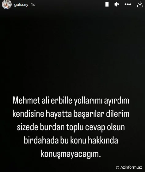 Bir müddətdir sevgili olan cütlük ayrılıb. Ayrıldıqdan sonra sosial media hesabından açıqlama verən Gülseren Ceylan " Mehmet Ali Erbillə yolları ayırdım. Ona həyatda uğurlar arzulayıram. Buradan toplu cavab verim, bu haqda danışmayacağam."