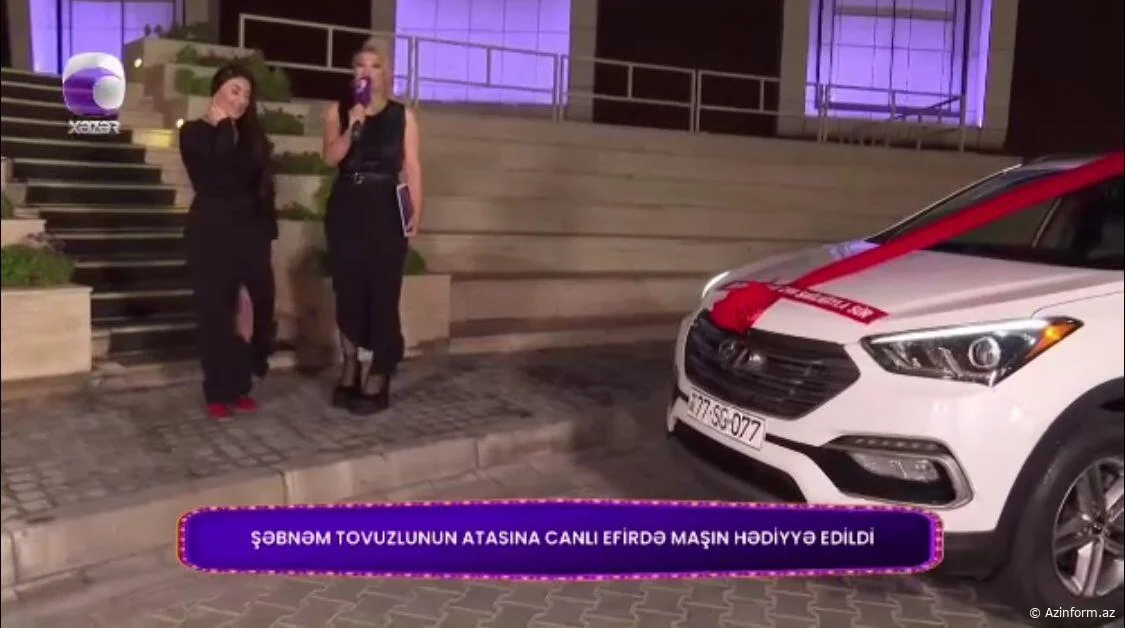 Proqramın aparıcısı Mətanət Əliverdiyeva sənətçini studiyadan çıxardaraq "Xəzər" televiziyasının həyətində dayanan həmin hədiyyənin yanına aparıb.